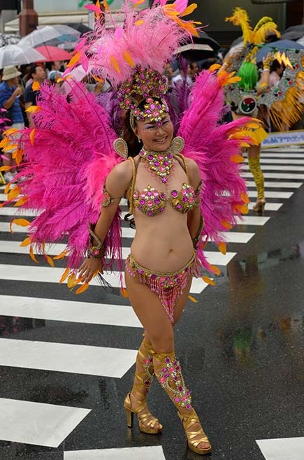 第35回浅草サンバカーニバル 写真特集 ―― 東京・浅草の夏の風物詩「浅草サンバカーニバル」が27日、東京都台東区の雷門周辺で行われた。あいにくの雨の中、華麗な衣装をまとったダンサーやきらびやかに装飾した山車がメイン通りに登場。打楽器隊の強烈なサンバのリズムに合わせ、ダンサーらが情熱的な踊りを披露した(2016年08月27日) 【時事通信社】