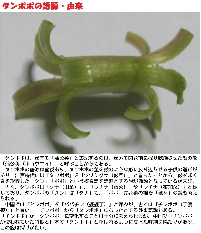 タンポポの名前の由来については諸説があります。有力なのは、頭花を鼓に見立て「タン・ポンポン」と音を真似たというもの。また、茎の両端を細く裂き水に浸けると鼓の形になるため、と言う説もあります。他に、タンポポの冠毛の形が昔日本にあった「たんぽ槍」に形が似ているところから名づけられたとする説もあります。