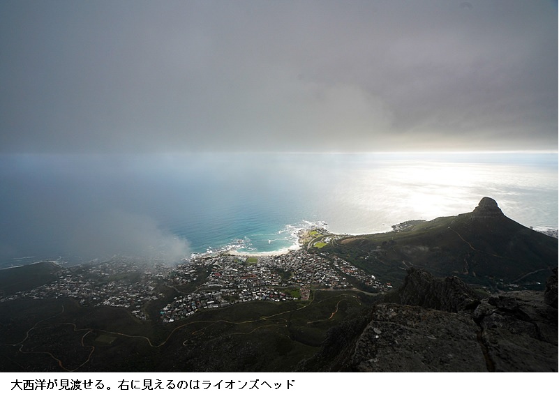中央部分にテーブルマウンテンがあり、その両端にはデビルズピークとライオンズヘッドというとがった山があります。固い珪質砂岩が浸食されて作られた、切り立った崖が美しい。海からの風で雲が出来やすく、薄く雲がかかると「テーブルクロス」のように見えます。