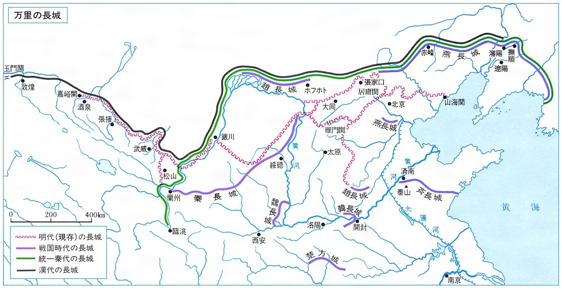 春秋時代の斉(せい)が領土防衛のため国境に築いたのが長城の起源で、戦国時代の諸国もこれに倣いました。秦(しん)の始皇帝は中国統一(前221年)後、匈奴(きょうど)の侵入を防ぐため、甘粛(かんしゅく/カンスー)省南部から北へ、黄河(こうが/ホワンホー)大屈曲部の北を巡って東に延び、東北地区の遼河(りょうが/リヤオホー)下流に至る長城を築きましたが、なかば以上、戦国時代の燕(えん)、趙(ちょう)などの長城を利用したものでした。この長城の東部の遺址(いし)が東北地区で発見されています。