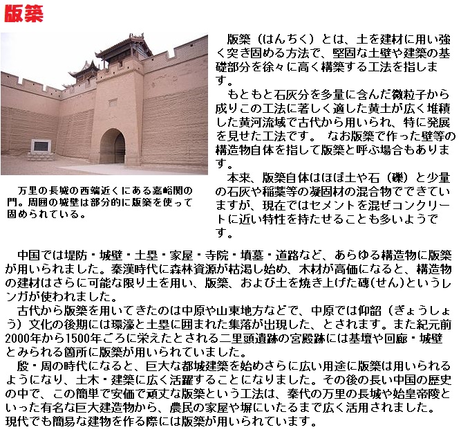 長城の構造は、古くは版築で、楊柳(ようりゅう)(ヤナギ)やアシなどを束ねて土と交互に重ね、突き固めてある。日干しれんがも一部に用いられていたが、山西方面より東方は明代以後、焼いたれんがで被覆されるようになりました。首都北京(ペキン)防衛のためもありますが、モンゴルの侵攻がこの方面で激しかったことを示しています。現在観光の対象となっている八達嶺(はったつれい/パーターリン)付近の長城は、高さ8.5メートル、厚さは底部6.5メートル、頂部5.7メートル。頂部上には高さ1.7メートルの連続した凸字状の垣である女牆(じょしょう)を築き、銃眼が開きます。また120メートル間隔で台(とんだい)(一種の見張り所)が設けられ、軍の駐留と監視に役だてました。