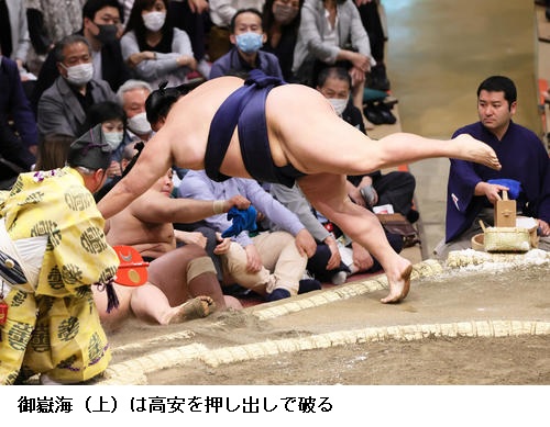 ▽大関 御嶽海に高安は御嶽海が「押し出し」。