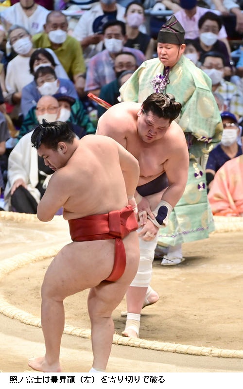 ▽横綱 照ノ富士に豊昇龍は、照ノ富士が寄り切りで豊昇龍を破って2敗を守りました。