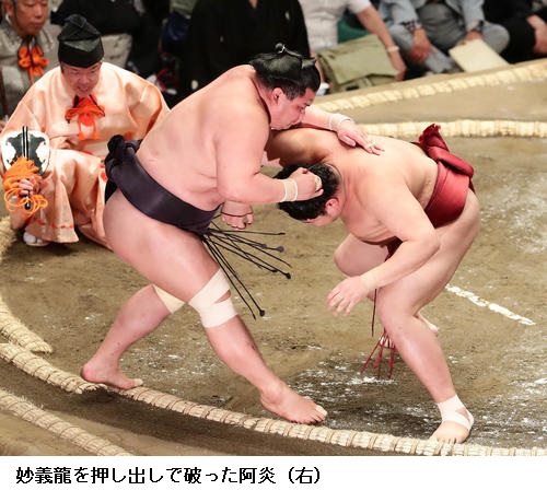 妙義龍に阿炎は、阿炎が押し出し。