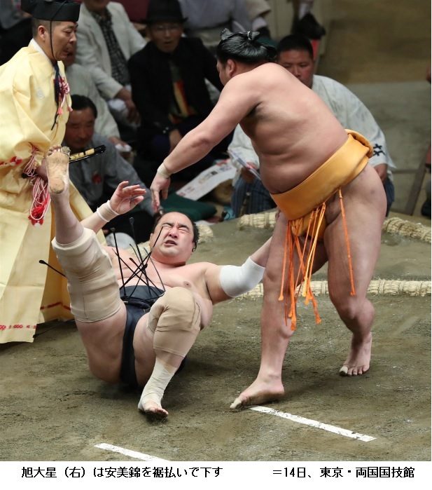 旭大星に安美錦は、旭大星がすそ払い。新入幕の旭大星は2日目の初白星です。