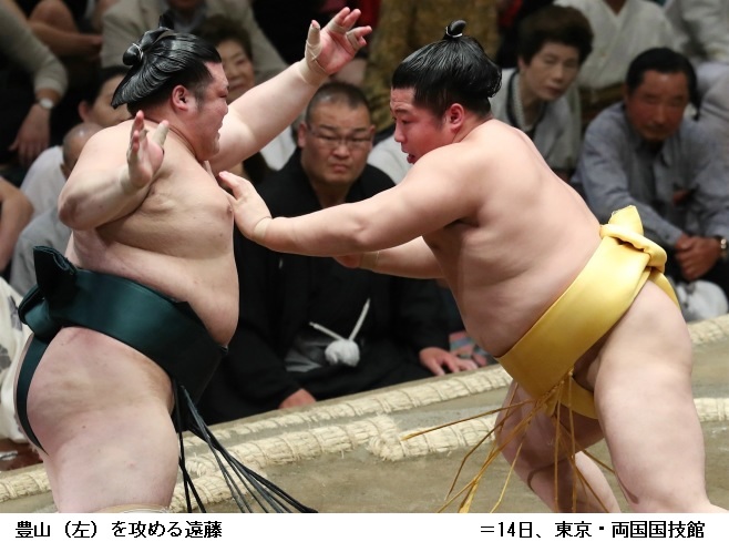 遠藤に豊山は、遠藤が引き落としで勝って新小結の場所2日目で初白星。