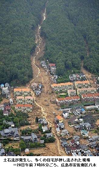 広島土砂災害39人死亡 安佐南・安佐北、7人不明 ―― 広島市内は20日未明、局地的に1時間に100ミリを超える豪雨となり、安佐南区と安佐北区で土砂崩れや土石流が発生して多数の住宅がのみ込まれた。広島県警によると、2歳男児や消防隊員を含む39人が生き埋めになるなどして死亡し、7人が行方不明となった。同県の豪雨災害としては、1999年に広島、呉両市などで計31人が死亡した「6・29豪雨」を超す被害となった。/広島地方気象台によると、日本海の前線に南から湿った空気が流れ込み、局地的に雨雲が発達。安佐北区可部町で、20日午前3時50分までの1時間雨量が130ミリを記録。同区三入でも20日午前1時半からの3時間雨量が観測史上最多の217.5ミリに達した。24時間雨量は、三入で257ミリ、安芸高田市美土里で91.5ミリ、広島市中区78.5ミリだった。/広島市の災害対策本部によると、20日未明から、生き埋めや川で流されたなどの119番が相次いだ。安佐南区山本では、民家に裏山の土砂が流れ込み、小学5年平野遥大(はると)君(11)と弟の都翔(とわ)君(2)が生き埋めになり、相次ぎ亡くなった。/県警は、いずれも安佐南区緑井の無職沢本範子さん(77)、広島市都市交通部長の竹内重喜さん(54)たちの死亡も確認。安佐北消防署の政岡則義消防司令補(53)=安佐南区毘沙門台=は、安佐北区可部東で住民を避難誘導した際、近くの畑中和希君(3)を抱えたまま土石流に巻き込まれ、2人とも死亡した。/同気象台は午前3時50分ごろ、大雨警報を超える「県記録的短時間大雨情報」を発表。広島市は、4時15分以降に、約20地区に避難勧告を出した。/交通機関も寸断された。国道54号は安佐南区と安佐北区の計2カ所で通行止め。JRは可部線緑井―可部間、芸備線三次―広島間で終日、運転を見合わせた。21日も運休する。/中国電力によると、落雷などで広島市を中心に延べ約5万9千世帯が停電。20日夕時点で、安佐南、安佐北両区で計約1300世帯が停電した。