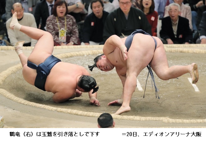 ▼関脇玉鷲に横綱鶴竜は、物言いがつきましたが行司軍配どおり、鶴竜が引き落としで勝って2敗を守りました。