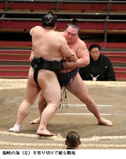 ▽隠岐の海に横綱・鶴竜は、鶴竜が寄り切り。