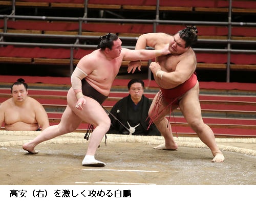 ▽横綱・白鵬に高安は、白鵬が寄り切りで勝ちました。