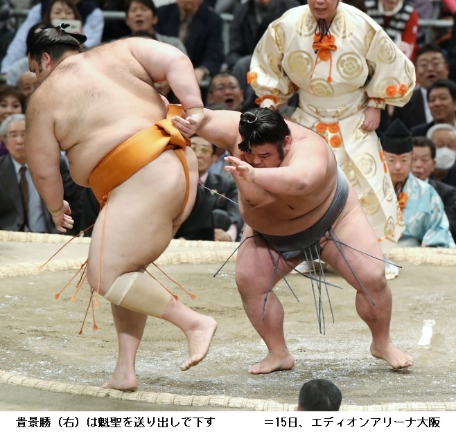 ▼魁聖に貴景勝は、貴景勝が送り出しで勝ちました。大関昇進がかかる貴景勝は14日、2敗目を喫しましたが、15日は危なげなく勝って連敗を免れ4勝目を挙げました。