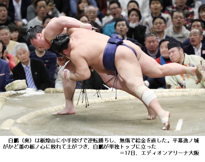 ▼栃煌山に横綱白鵬は、白鵬が栃煌山に後ろに回られ危ない場面もありましたが、小手投げで勝って8連勝。ただ一人勝ち越しを決めました。