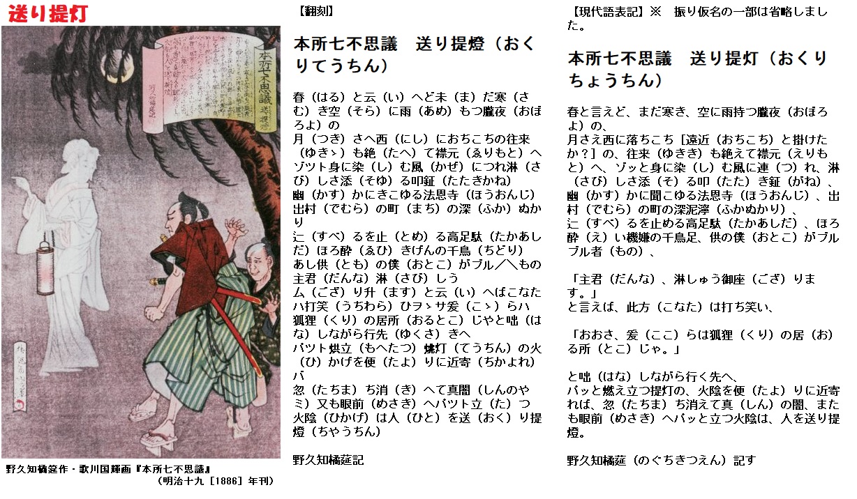 酔った侍が歩いていると、提灯を下げた女が現れます。近寄ろうとすると女はす~っと消え、離れるとまた現れます。どこまで行っても提灯の明かりは同じ距離を保って進み、追いつくことができません。これも怖いですね。