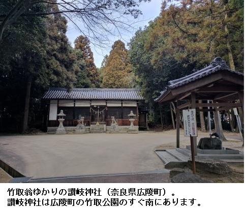 竹取物語において、竹取の翁はその名を「讃岐造(さぬきのみやつこ)」とされ、その出身部族である讃岐氏は、持統-文武期に朝廷に竹細工を献上するために讃岐国(さぬきのくに)の氏族斎部(いちべ)氏が大和国広瀬郡散吉(さぬき)郷に移り住んだものだそうです。
