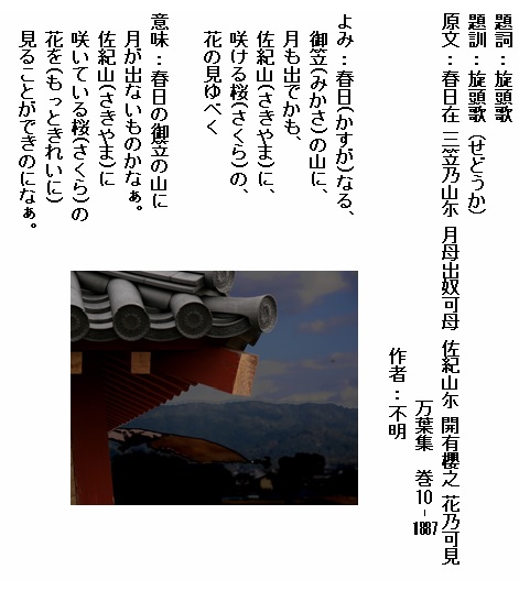 巻10-1887: 春日なる御笠の山に月も出でぬかも佐紀山に咲ける桜の花の見ゆべく