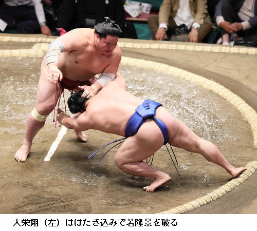 ▽大栄翔に若隆景は大栄翔がはたき込み。