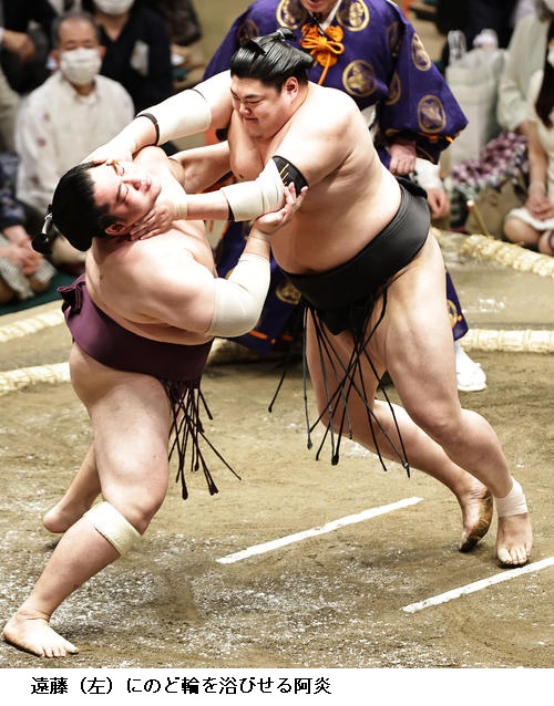 ☆阿炎 (対戦した遠藤は)すごく突きにくかったというか、突けなかった。距離を保つのに必死に手を伸ばしてたんですけど、うまい具合に突けなかった。稽古でも流れからの四つをやっていたんで、それが出て良かった。昔だったらすぐに投げていたけど、寄るということができたのは稽古をしてきたからかな。まだまだ自信を持ってではないけど、集中できている証拠かな。これを糧に明日からも一番、一番集中してやりたい。
