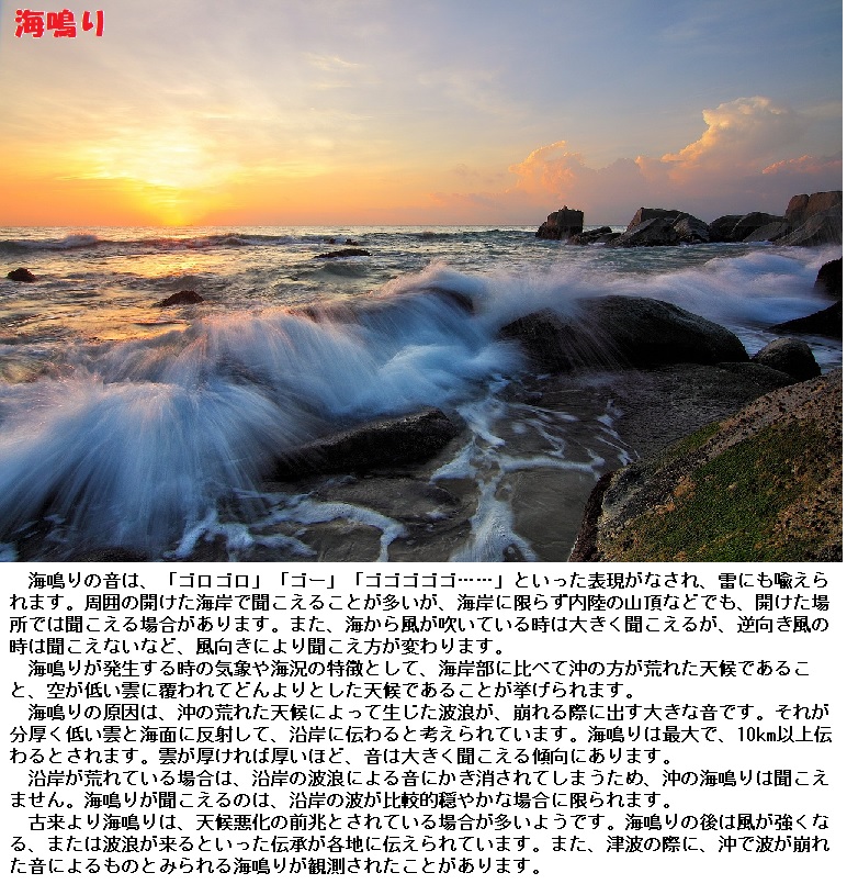 ④海鳴 晴天が崩れて雨になる前に、南方の海上から聞こえてくる潮の遠鳴り。風雨から晴天に変わるときは北方から聞こえてくる。