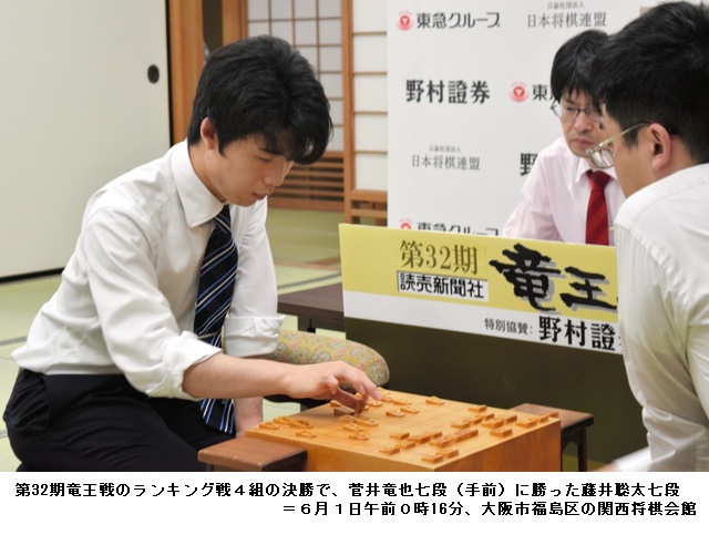 藤井七段、千日手経て勝利 竜王戦決勝トーナメント進出 ―― 将棋の高校生棋士、藤井聡太(そうた)七段(16)が31日、第32期竜王戦(読売新聞社主催)ランキング戦4組の決勝で、菅井竜也(たつや)七段(27)に勝ち、広瀬章人(あきひと)竜王(32)への挑戦権を争う決勝トーナメント進出を決めた。日本将棋連盟によると、プロデビューから3期連続で竜王戦のランキング戦で優勝したのは藤井七段が初めて。