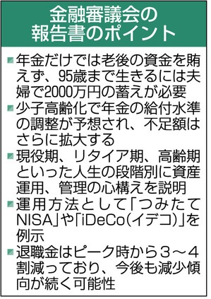 金融審議会は首相、金融担当相らの諮問機関。報告書は今月三日に金融審議会の「市場ワーキング・グループ」が公表したもので、平均的な無職の高齢夫婦世帯で月五万円の赤字が見込まれ、二十年間で約千三百万円、三十年間で約二千万円が不足するとした。