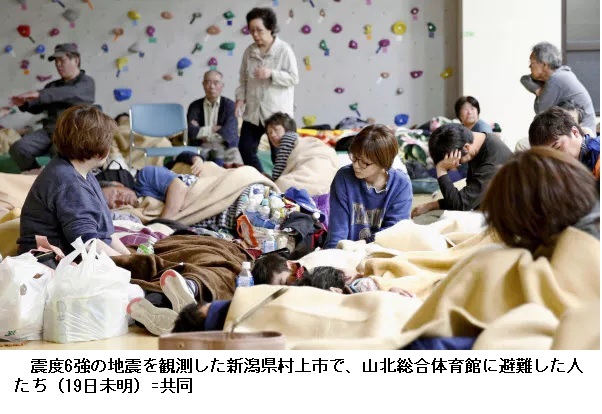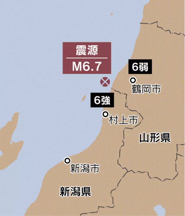 各地の主な震度は次の通り。震度6強=新潟県村上市▽震度6弱=山形県鶴岡市▽震度5弱=新潟県長岡市、柏崎市、山形県酒田市、秋田県由利本荘市など