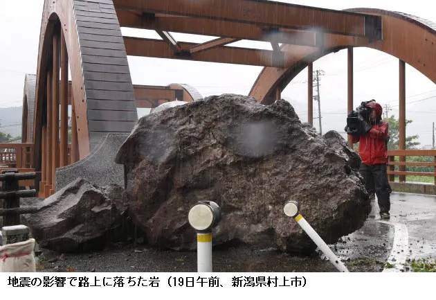 新潟、山形県などでは斜面崩落や屋根瓦の落下、ブロック塀の倒壊などの被害が出ている。村上市では斜面が崩れ、山肌がむき出しになっているのが確認された。