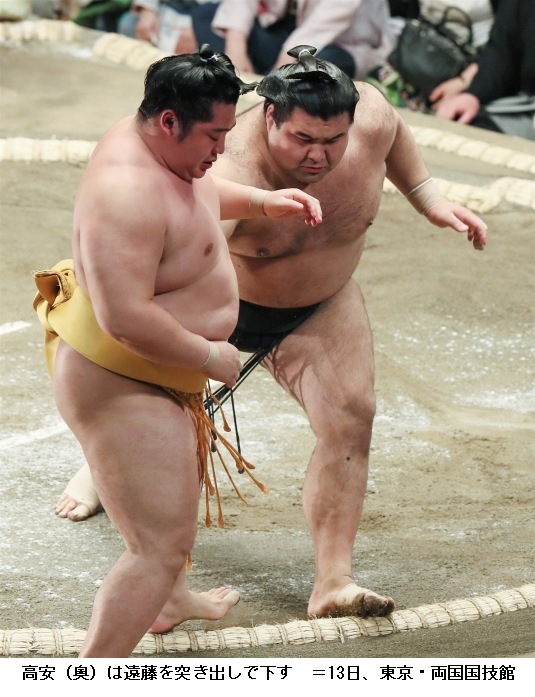 大関豪栄道に遠藤は、遠藤が寄り切り。