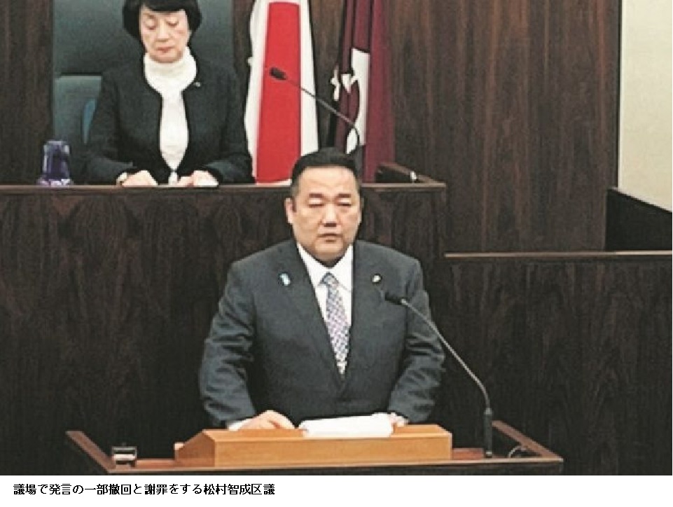 松村区議は9月20日の定例会一般質問で「偏向した教材や偏った指導があれば(子どもを)同性愛へ誘導しかねない」と持論を展開。「男性や女性の特徴を軽視するような教育を行っては児童が混乱する」と語った。所属会派の区議会自民党が発言の一部撤回とおわびを議会に申し入れていた。 【東京新聞 2023年10月26日 18時58分】