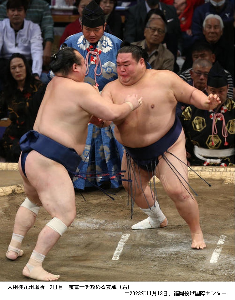 右膝の大けがで序二段まで番付を落としてから、23場所ぶり返り入幕の友風(28=二所ノ関)が、4年ぶりに幕内白星を挙げた。左四つに組み止めたい宝富士を、終始突き放して押し出した。幕内経験者が序二段まで番付を落とした後に再入幕するのは、照ノ富士、宇良に続いて3人目。幕内力士として白星を挙げたのは、19年秋場所千秋楽(千代大龍戦)以来となった。引き揚げる際には、出迎えた二所ノ関部屋付きの中村親方(元関脇嘉風)から「おかえりなさい」と、声を掛けられた。