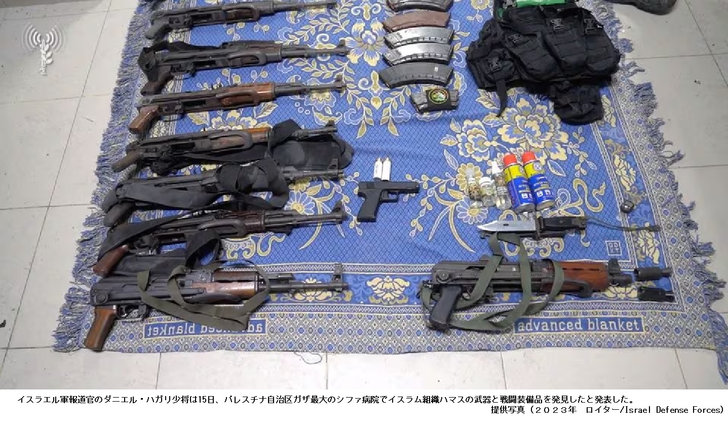 像を公開=イスラエル軍 ―― [エルサレム 15日 ロイター] - イスラエル軍報道官のダニエル・ハガリ少将は15日、パレスチナ自治区ガザ最大のシファ病院でイスラム組織ハマスの武器と戦闘装備品を発見したと発表した。