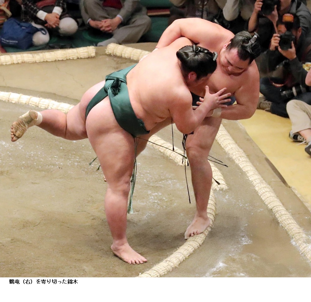 ▽横綱 鶴竜に錦木は、錦木が寄り切りで勝ちました。鶴竜は連敗です。
