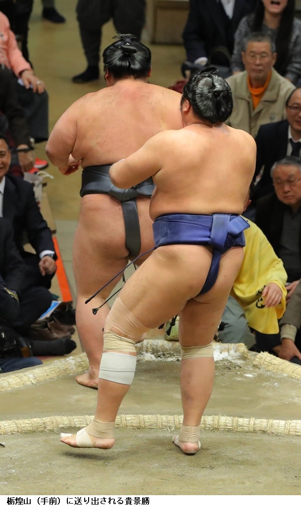 ▽関脇貴景勝に小結妙義龍は、貴景勝が押し出し。