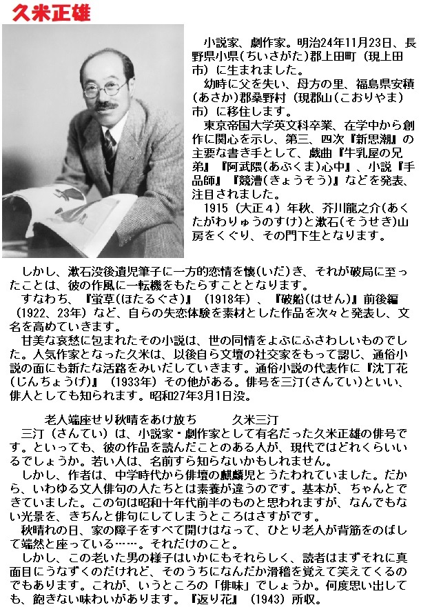 ……新しき時代の浪曼主義者ロマンチシストは三汀久米正雄である。「涙は理智の薄明り、感情の灯し火」とうたえる久米、真白草花の涼しげなるにも、よき人の面影を忘れ得ぬ久米、鮮かに化粧の匂える妓の愛想よく酒を勧むる暇さえ、「招かれざる客」の歎きをする久米、――そう云う多感多情の久米の愛すべきことは誰でも云う。が、私は殊に、如何なる悲しみをもおのずから堪える、あわれにも勇ましい久米正雄をば、こよなく嬉しく思うものである。