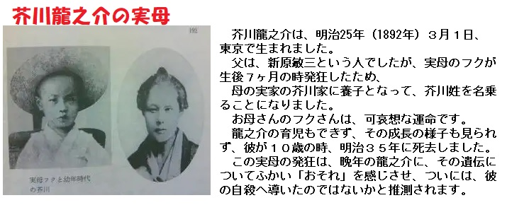 ■芥川の自殺の原因が奈辺にあったのかについては諸説挙げられています。母の血を引く発狂への恐れ、芥川と新原の両家を一身に背負わなければならない重圧、複数の女性問題、文壇の寵児を育てた伯母と養父母との力関係、そして創作の根本的な問題があるようです。