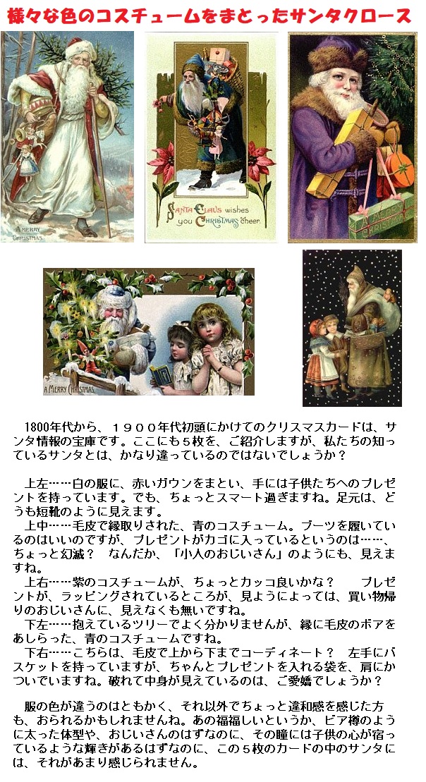 それまでの絵本や絵画の中に、サンタクロースは青い服を着たり、さまざまな色の衣装を着ていたそうです。今とはずいぶんイメージが違います。