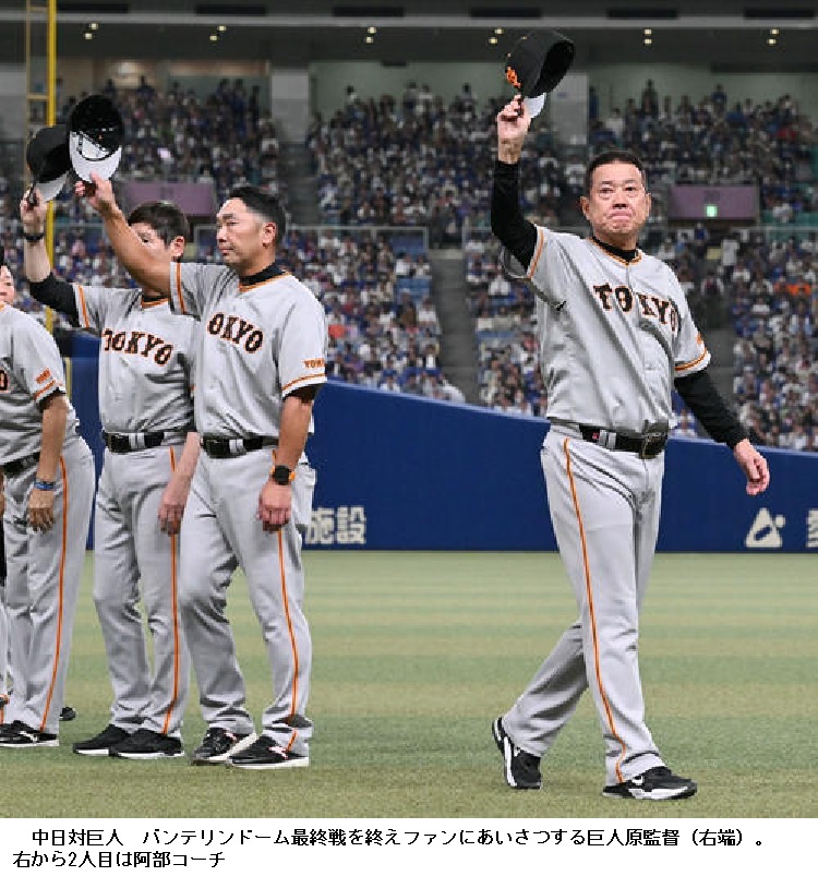 【巨人】原辰徳監督が退任 後任は阿部慎之助ヘッド兼バッテリーコーチが決定的 ――巨人原辰徳監督(65)が今季限りで退任することが3日、分かった。監督通算17年目の今季は4位にとどまり、2年連続でCS進出を逃した。同一監督の2年連続Bクラスは球団史上初という屈辱を突きつけられた。19年からの第3次政権では19、20年とリーグ2連覇に導いた。21年オフに新たに3年契約を結んだが、最終年となる来季を待たずに身を引く。新監督は阿部慎之助ヘッド兼バッテリーコーチ(44)の内部昇格が決定的となった。