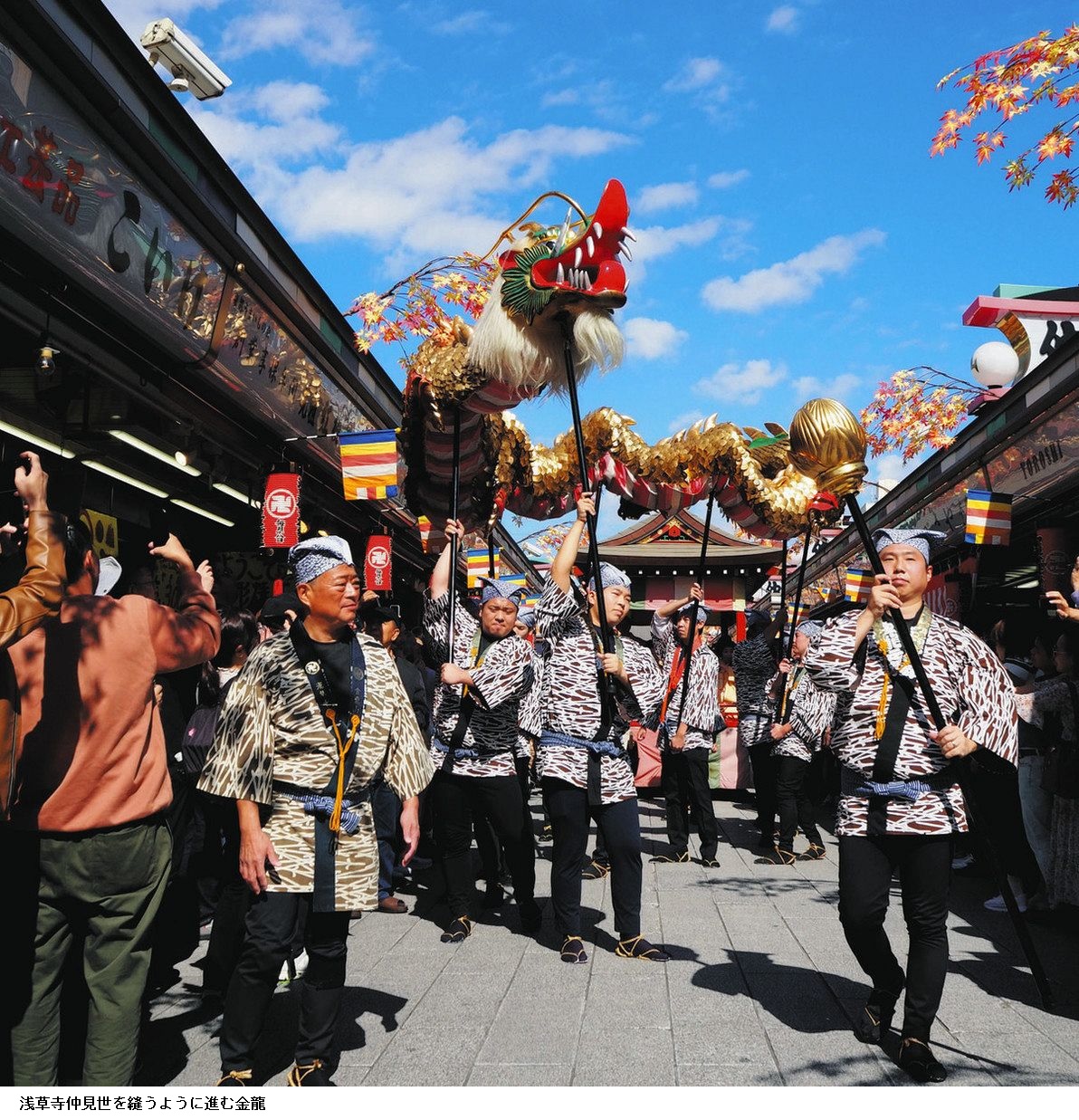 この日は午前と午後、3回にわたって奉演された。1回目は伝法院の門前を出発した金龍が、執行委員の鳴らすささらや太鼓、浅草芸者衆による笛や三味線の演奏に合わせ、浅草寺仲見世を練り歩いた。