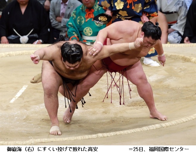 並んでいた大関高安が結びで関脇御嶽海にすくい投げで敗れた。御嶽海は7勝8敗。