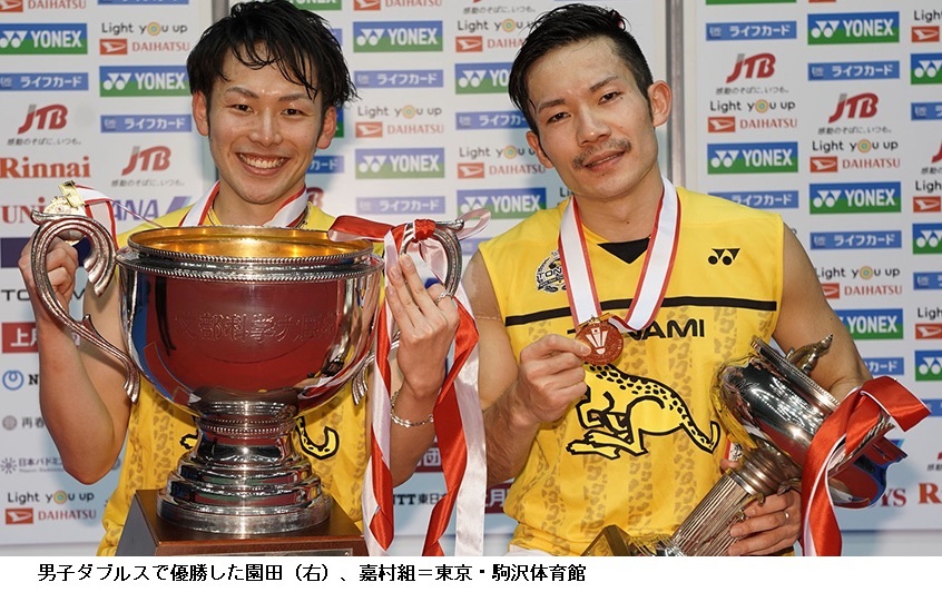 男子ダブルスは、今夏の世界選手権銀メダルの園田啓悟、嘉村健士組(トナミ運輸)が2年ぶり3度目の優勝、混合ダブルスは渡辺勇大、東野有紗組(日本ユニシス)が2連覇した。