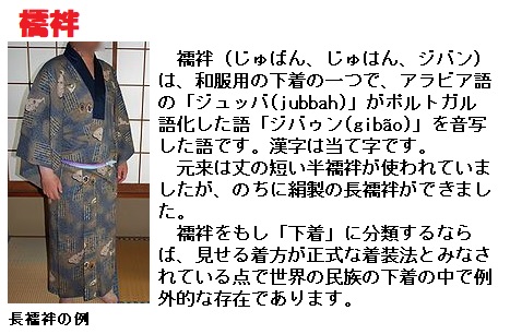 既存の語を命名に利用するという場合、その種類はいくつもあります。外国語に由来する語、すなわち外来語の場合などは、その著しい例といえます。例えば、着物を着るときの下着をジュバンと言って、「襦袢」の字を当てています。ジュバンは、もとポルトガル語の gibão で、肌着カジャケツのようなものを指す語であったようです。すなわち、この語は元ポルトガル語という、日本語とは別の言語体系の中で、そういう意味を持つ記号として行われていたものです。それを、体裁は違うけれども、「肌に近くつけるもの」であるという点の共通性によって、日本語において、着物用の下着を指す名として借用するようになったものです。こう言う経緯を、「襦袢の語源は、ポルトガル語 gibão である」という言い方で説明します。