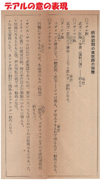 当時の話コトバの末尾に来る「デアル」の意の表現で初期東京で話されていたコトバの分類表を見ると次のようになります。