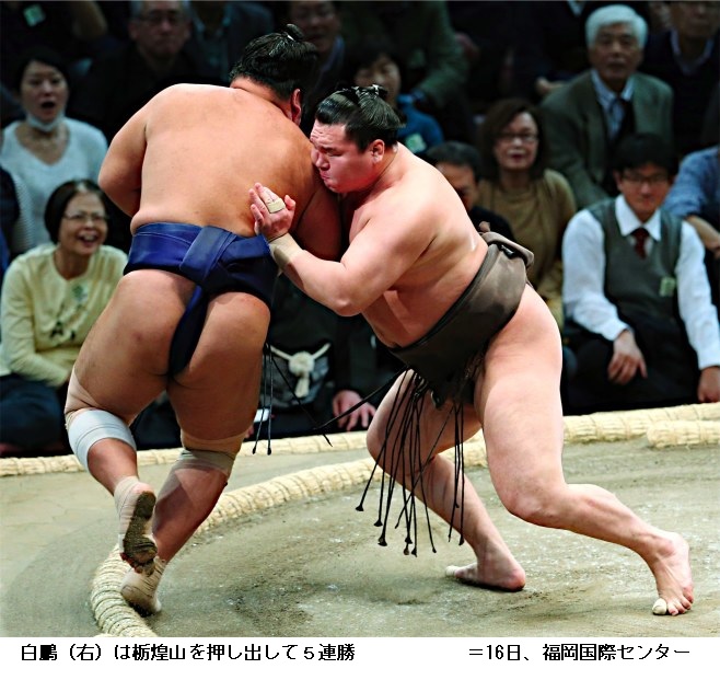 栃煌山に横綱・白鵬は白鵬が押し出し。白鵬も5連勝です。
