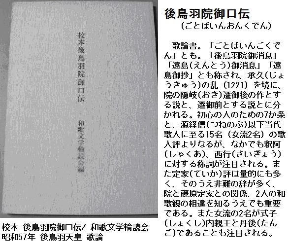 又、寂蓮・定家・家隆・雅經・秀能等なり。寂蓮はなほざりならず歌よみしものなり。あまり案じくだきし程に、たけなどぞかへりていたくたかくはなかりしかども、いざたけ有歌よまむとて、たつたのおくにかゝる白雲、と三體の歌によみたりし、おそろしかりき。おりにつけて、きと歌よみ、連歌しの至狂歌までも、にはかの事も、ゆへ有樣にありしかたは眞實堪能とみえき。家隆は、若かりしおりはいときこえざりしかど、建久のころほひよりことに名譽も出きたりき。歌になりかへりたるさまかひがひしく、秀歌どもよみあつめたるおほき、誰にもまさりたり。たけもあり心もめずらしく見ゆ。雅經はことに案じ、かへりて歌よみしものなり。いたくたけ有歌などは、むねとおほくはみえざりしかども、てだりとみえき。秀能は身の程よりもたけありて、さまでなき歌も殊外にいでばヘするやうにありき。まことによみもちたる歌どもの中には、さしのびたる物どもありき。しか有を、近年定家無下の歌のよしと申ときこゆ。女房歌よみには、丹波やさしき歌あまたよめり。