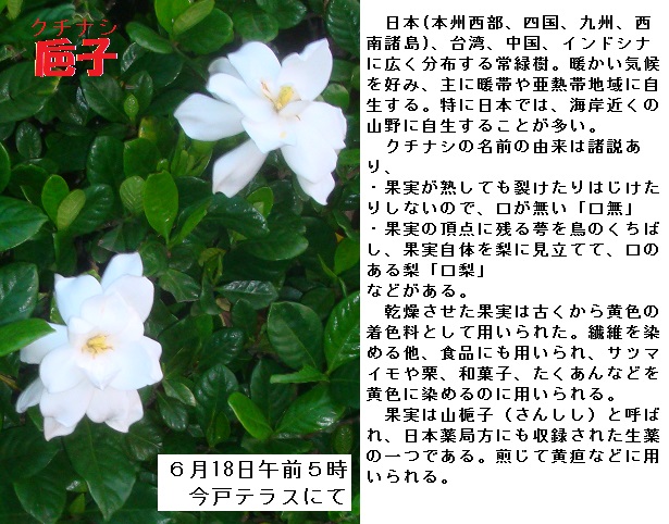 今朝も桜橋~白鬚橋の間のテラスを往復して、帰宅しました。今戸近辺では今が盛りなのか梔子(くちなし)が沢山咲いていました。