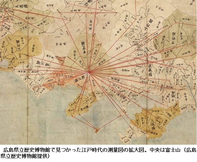 日本地図:初の全国測量の原図見つかる 徳川吉宗の時代 ―― ◇広島で確認 「伊能」前に完成:広島県立歴史博物館(福山市)は9日、江戸幕府八代将軍、徳川吉宗が命じて初めて全国的に測量して作られた日本地図「享保日本図」の測量原図が見つかったと発表した。享保日本図は清書が2枚あることが江戸時代の書物に記されているが、原図が確認されたのは初めて。専門家は「当時の測量技術を知る貴重な資料」と話している。/原図の縮尺は21万6000分の1で、縦152センチ、横336センチ。江戸後期に伊能忠敬(1745〜1818)らが全国を測量して作った「大日本沿海輿地(よち)全図」より前の1725年ごろに完成したとみられ、蝦夷(えぞ)地(北海道)南部から種子島(鹿児島県)まで記されている。/博物館によると、江戸幕府は計6回日本地図を製作。4回までは各藩に提出させた地図を組み合わせていたため、あまり正確ではなかった。5回目の享保日本図は、見通しが良い山や港など測量地点203カ所を幕府が指定し、各藩の測量データを集めて完成させた。一つの地点を複数の地点から見通す「望視交会法」という測量手法が取られ、富士山や彦根城などと各地点を結ぶ赤い直線が引かれている。/原図は福山市出身で元米証券メリルリンチ日本法人会長の守屋寿さん(72)=東京都在住=が、博物館に寄託した古地図などの資料848点の中にあった。守屋さんが10年以上前に都内で購入したという。東亜大の川村博忠客員教授(歴史地理学)は「江戸時代の高い技術や幕府の地図作製過程が裏付けられる」と評価している。/原図は博物館で13日から公開される。 (毎日新聞 2014年05月10日 07時30分〈最終更新 05月10日 07時59分〉)