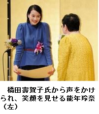 橋田氏「あまちゃん」見ずに表彰!? ―― 脚本家の橋田壽賀子氏(89)が、放送文化に貢献したテレビ番組や個人に贈る「第22回橋田賞」の表彰式が10日、都内で開かれた。昨年大ヒットしたNHK連続テレビ小説「あまちゃん」が橋田賞を、主演の女優・能年玲奈(20)が橋田賞新人賞を受賞したが、橋田氏は「あまちゃん」を見ていないと仰天告白。これには能年も驚きを隠せなかったが、世代を超えた絶妙なやりとりも見せた。/軽妙な開会の辞を述べる橋田氏に能年もウケていたが、いざ「あまちゃん」が受賞の段になると笑ってはいられなかった。/橋田氏は「すいません、私『あまちゃん』見てないんです、実は…。朝はトレーニングや水泳の時間でして、全部は見てません」と告白。ちなみに次の「ごちそうさん」は「食いしん坊なので」見ていたという。/びっくりした表情の能年だったが、「あまちゃん」のスタッフに壇上に呼び込まれると、腰に手を当て、「皆さん初めまして、海女のアキです!」とあいさつ。「橋田壽賀子さんに『あまちゃん』全編を見ていただけるよう、今日は身を引き締めて頑張ります!」と気合を入れた。/受賞スピーチでは「(橋田氏は)朝ドラの大先輩『おしん』の生みの親で、お会いするのが恐れ多かった」と話したところでフリーズした能年だが、橋田氏がすかさず「『じぇじぇじぇ』でいいのよ!」と助け舟。解凍した能年は「これがスタートライン。ちゃっかりしっかりいただきたいと思います。じぇじぇじぇ!」と、無事に乗り切った。/ともに国民的な人気を博した朝ドラ「おしん」の作者と「あまちゃん」のヒロインが出会った歴史的な日。橋田氏は「他の人じゃ『あまちゃん』はあんなに評判にならなかった」と、ピュアな能年に好感を抱いた様子だった。 (ディリースポーツ 2014年5月11日)