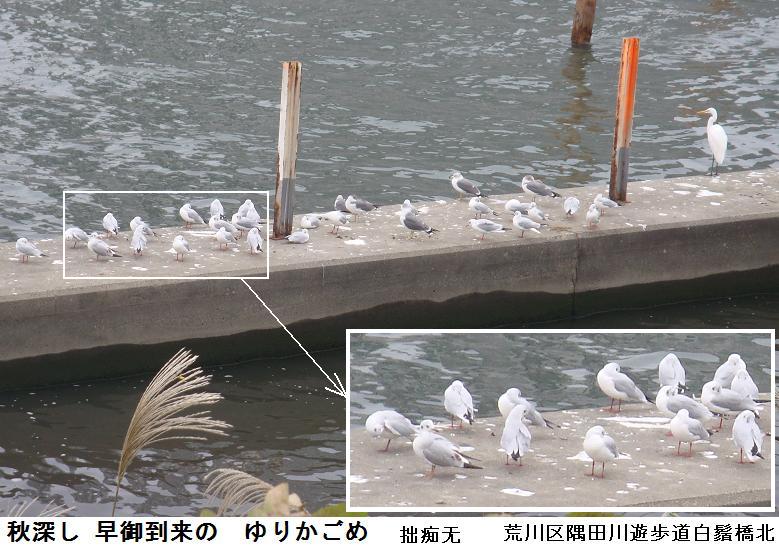 春の女は感傷に耽り、秋の男は悲傷に暮れるという。昨日は桜橋を渡り、遊歩道を通って明治通りへ。東白鬚公園を抜けて水神大橋を渡る。汐入公園からもうひとつの「さくら橋」を渡り、何時もの荒川区の遊歩道に出る。小春日和のポカポカ陽気に汗ばみながら、台東区の隅田川沿い遊歩道を南下して帰宅する。10723歩、6.9kmが昨日の記録。