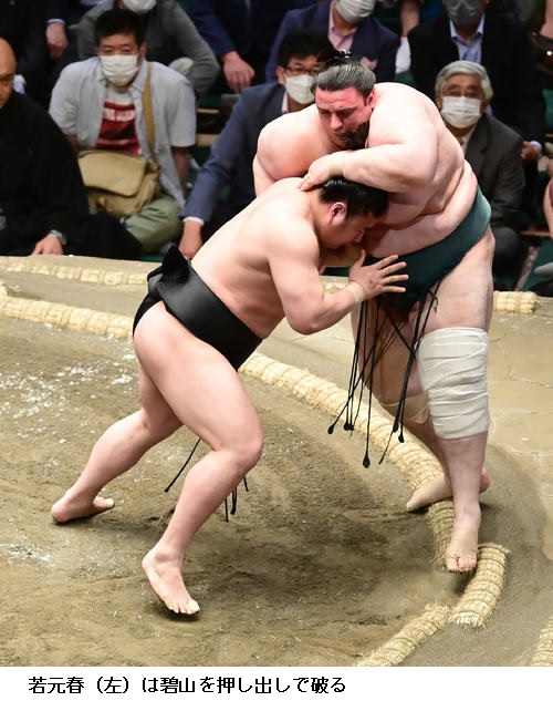 ☆若元春 (対戦した碧山は)大きい相手だったので、前に、前に出るという意識しかなかった。足が出てから、おっつけも効きましたね。(後半戦に向けて)全体通して前に攻める相撲が多いので、良い感じ。