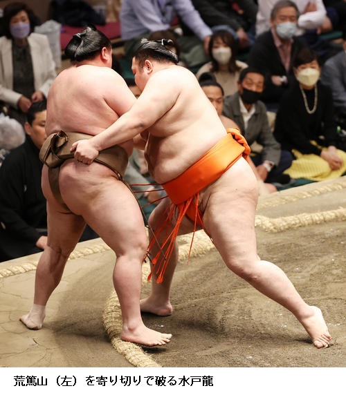 平幕 荒篤山は今場所初白星を挙げ「初日が出るまで長かった。7連敗を考えてもしかたないので、1日一番に集中したい」と後半に向けて気持ちを入れ直しました。