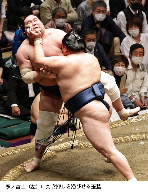 ▽玉鷲に横綱 照ノ富士は玉鷲が押し出しで勝ちました。玉鷲はことしの初場所から3場所続けて金星を挙げました。